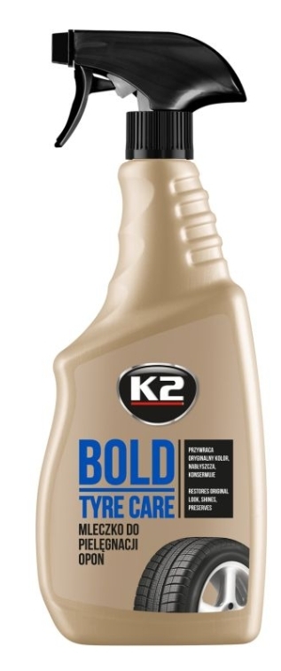 K2 Bold to szybki i łatwy w użyciu środek przeznaczony do nabłyszczania i konserwacji opon. Przywraca oryginalny wygląd, nadaje lśniący połysk i głęboką czerń. Chroni przed promieniami UV, pękaniem oraz matowieniem. Dzięki właściwością hydrofobowym ogranicza osadzanie się zabrudzeń. Może być używany również do nabłyszczania i konserwacji innych powierzchni gumowych oraz plastikowych.