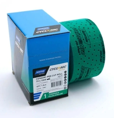 Zielona rolka ścierna NORTON Cyclonic. Nacinane rolki ścierne z perforacją NORTON Multi-Air Cyclonic zostały specjalnie opracowane przy zastosowaniu najnowszego systemu odprowadzania pyłu NORTON Cyclonic. Rolki zostały wykonane z zastosowaniem wysokiej jakości, ceramicznej powłoki No-fil A975 i w zależności od zastosowania posiadają odpowiednie oznakowanie kolorystyczne, umożliwiające szybki i prosty wybór produktu. Perforowane arkusze w rolkach NORTON Cyclonic na podkładzie Self-Grip dostępne są w jednej szerokości dzięki czemu mogą być używane z bloczkami szlifierskimi 70x125mm, 70x198mm oraz 70x420mm.